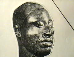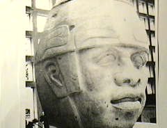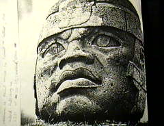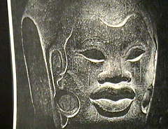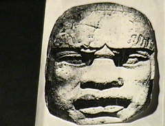 This stone belt was used by the Olmec ballplayers to catch the impact of the rubber balls in their ball games. This face is typical Negritic, including the eyes which seem to "slant," a common racial characteristic in West Africa, the Sahara and in South Africa among the Kong-San (Bushmen) and other Africans.