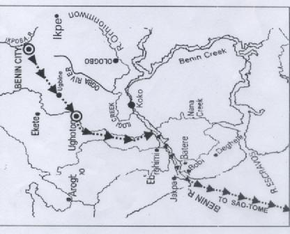 The party got to the mouth of the GWATTO (Ughoton) creek, where the OVIA river empties its waters into the Benin river. They rowed past it, thereby missing the water-way to Ughoton. Sometime later, many kilometers up-stream on the Benin River, they got to where the ILOGI creek, carrying the waters of the Orhionmwon River, emptied ¡into the Benin River, near the modern rown of KOKO. They also rowed past it, and thereby failed to get into the Orhionmwon River, upstream of which Okhuaihe was waiting for the visitors at the Ikpe waterside village, near Benin.