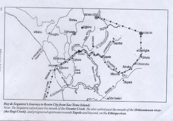 De Sequeira stayed in his canoes, on the Benin River, up to where Sapele town is now situated, at the bifurcation of the Benin River into its two main tributaries of the Ethiope (Olokun) and the Jamieson (Igbaghon) rivers. He must have decided that, of these two branches, the Ethiope River was the main branch of the Benin River, and that Benin City lay along its banks further up-stream. He progressed upstream on the Ethiope river in his canoes, past the sites of the present—day EKU and ABRAKA towns, until after OBIARUKU town the river became just a rivulet, forcing De Sequeira to abandon his canoes, and to complete the rest of his journey on foot, disappointed that the Benin river did not take him right across into the heartland of the African continent.